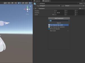 そして、inspectorの一番下のAdd componentから、FloorAdjusterを追加します。by skeletonとby scaleがありますが、by skeletonは新バージョンで、UnityのHumanoidのデータを弄ることによって上下位置を無理矢理移動しています。by scaleは旧バージョンで、アバターのArmatureのスケールを調整してHipsボーンを移動させる&Hipsボーンにスケールの逆数をかけることで大きさを保つ手法をとっています。今回は、操作が分かりやすいby scaleで説明します。もしby scaleでエラーが出る場合、by skeletonに変えるとうまくいくと思います。