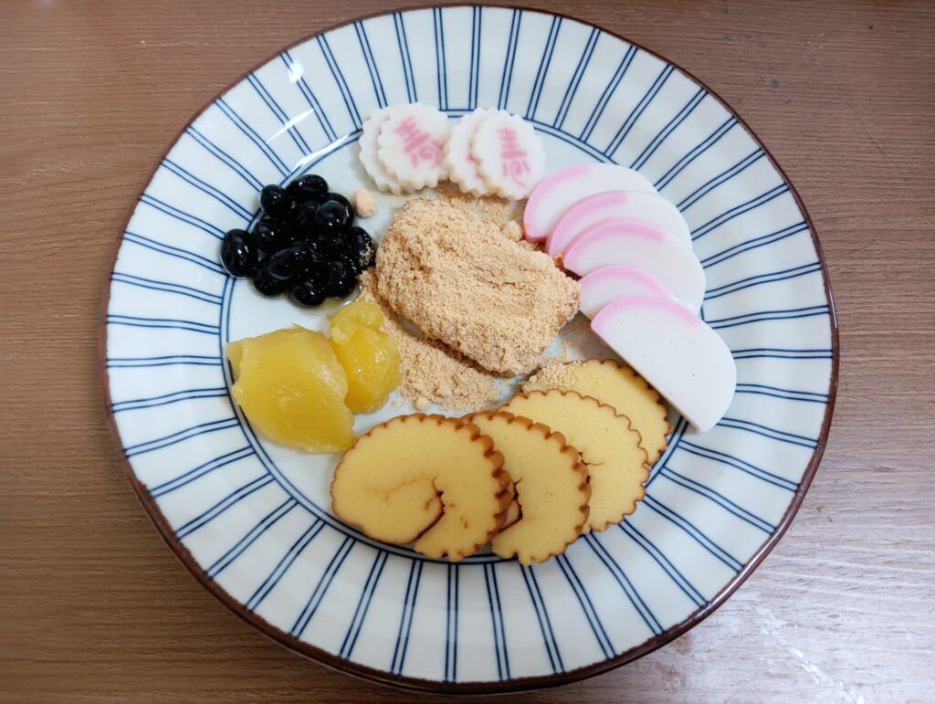 1.おせちセットの、紅白かまぼこ、だて巻きを切ってお皿に盛りつける