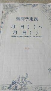 複数のお方にご意見をいただいたところ、左のページにもう少し工夫があってもいい、という事と、ノートの題名を単なる「週間スケジュールノート」ではなく、もっと違うものにした方がいい、というフィードバックをいただきました。