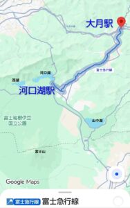山梨県の「大月駅~富士山駅~河口湖駅間」を大月線と河口湖線で結ぶ全長26.6kmの山の間を走る観光客で賑わう路線です。