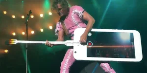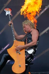 世界には個性的なベースを使用する人が存在します。私が知っている中で最も変なベースを使用する人は、デンマークのバンドD.A.DのベーシストStig Pedersen(スティッグ・ペダーセン)です。1枚目の画像のベースは、本来ボディーの部分に特大のヘッドがあり、ヘッドの部分に小さいボディーが付いており、リバースベースと呼ばれています。2枚目の画像は、通称iPhoneベース。見てわかるとおり、ベースのボディーがスマホのiPhoneになっています。このベースにはスマホと同じくカメラが内臓されており、観客をベースのボディー部分の液晶画面に映すことが出来ます。彼は他にも変なベースを多数所有しており、しかもベースの弦の本数が2本しかありません。2枚の画像のベースも弦は2本です。なぜ、通常の4弦ベースを使わないか問われると、彼は必要ないから、と答えました。潔いシンプルな理由でしたね(笑)。