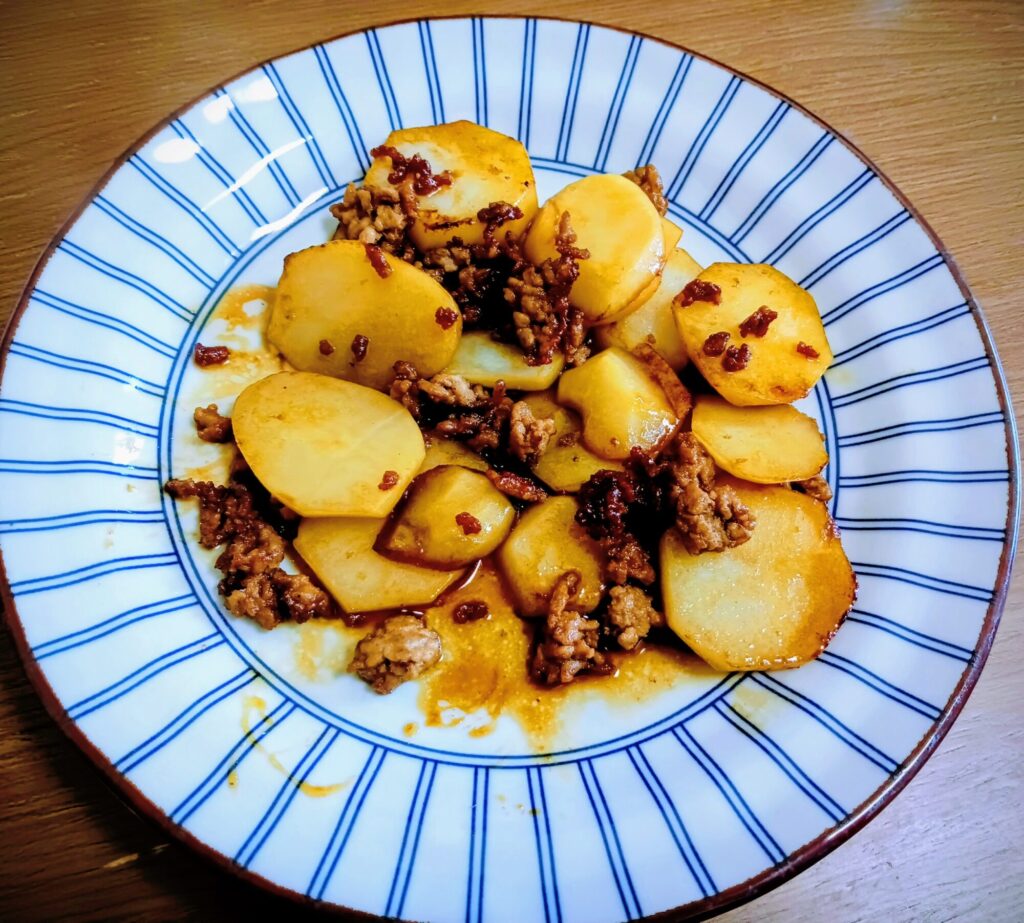 2.サラダ油を入れ、豚ひき肉を炒め、じゃがいもをフライパンで焼く。