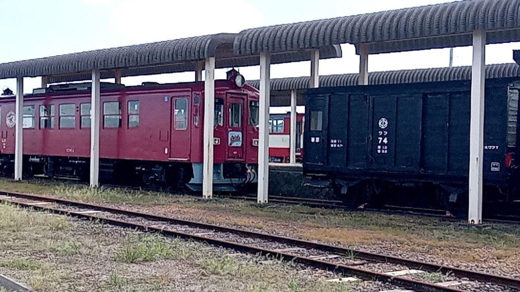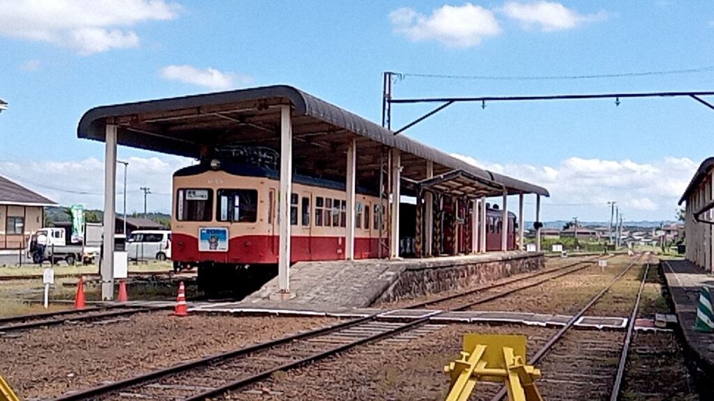 赤い車両はKD95形。1995年に栗原電鉄からくりはら田園鉄道に社名を変更して電車からディーゼルに変えたのと同時にデビューしたディーゼル車両です。