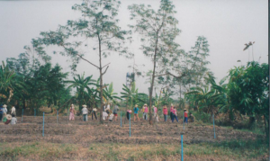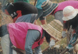 第1日目のwork_私達は、まず鍬を渡され、穴掘りから始めた。1日の仕事時間は短いのだが、とにかく炎天下。きついの一言だ。タイは、なにしろ土が悪く、石のように固くちょっとやそっとではくずれない。鍬を持つ事にも、穴を掘ると事にも慣れていない私達は、そんな硬い土をちょっとづつ ちょっとづつ削っていくしかなかった。その仕事は永遠のように思われた。このワークキャンプに参加することを決めた時に自分なりにある程度覚悟していた筈なのにいざやってみると、2,3時間で「もう、嫌だ」という気持ちに駆られてしまった。ところが子供達の鍬の使い方がとても上手な事にびっくりしてしまった。小さな体に鍬を持ち、どんどん削っていく。私達は随分と助けられた。初めは辛いと思ったworkも少しづつ慣れて来て、汗を流して子供達と一緒に働くという事にちょっとした喜びさえ感じ初めた頃、スプリンクラーは完成した。