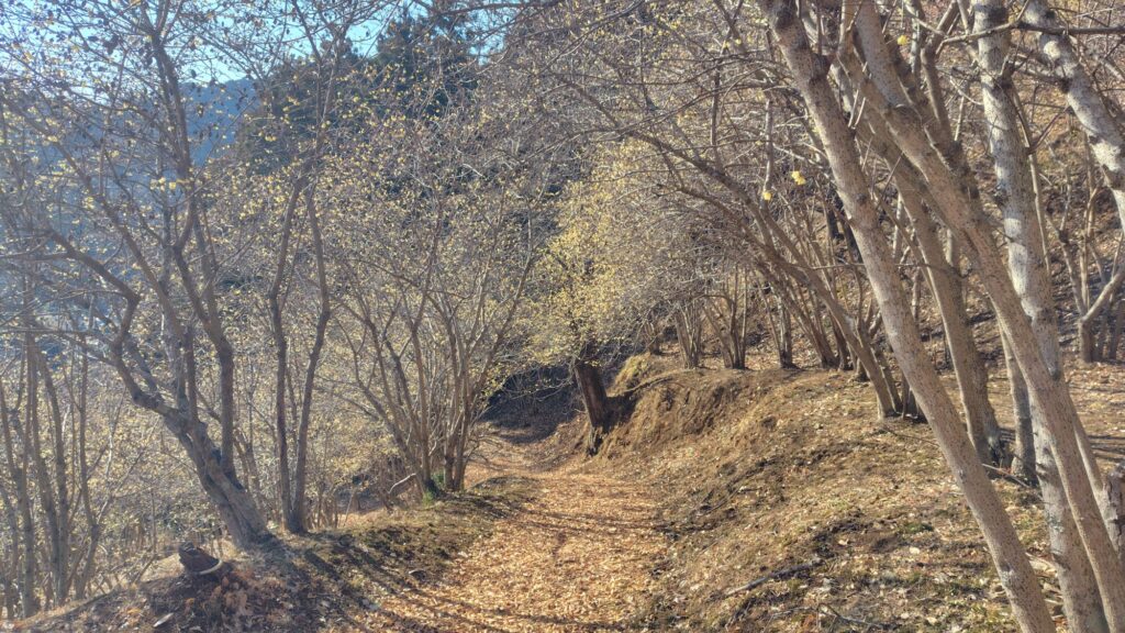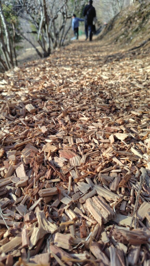 里山の斜面ですので登っていく形になりますが、遊歩道がそこそこ整備されているので履きなれたスニーカーで充分ですね。