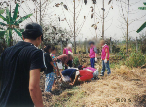 ・G_(学生)、タイ版ガチャピンの彼は、とても大きな体をしている。一見19歳には見えないが、しゃべると子供っぽい所もあったりする。<ワーク中の一コマ)みんなが鍬を持って必死に穴掘りをしていた時、Gがいない。しばらくすると、大きな体の彼はなぜか小さな女の子と一緒に水配りをしていた。何故・・・?