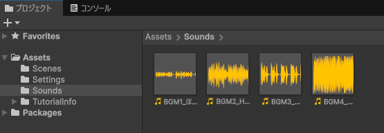 Soundsフォルダができたら、Soundsフォルダに音源ファイルをドラッグ&ドロップ。音源ファイルがUnityプロジェクト側にコピーされます。