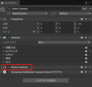 音楽を聞くオブジェクトの設定をします。ヒエラルキーのMain Cameraをクリックして、インスペクターの下の方にAudio Listenerが入っていればOK。今回は最初から設定されてました。もしなければ、「コンポーネントを追加」からAudio Listenerを検索・選択して追加したらOK。