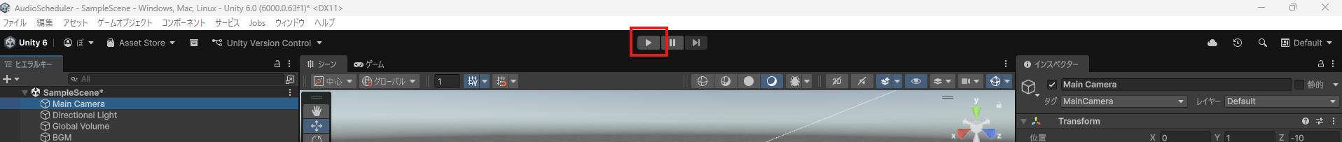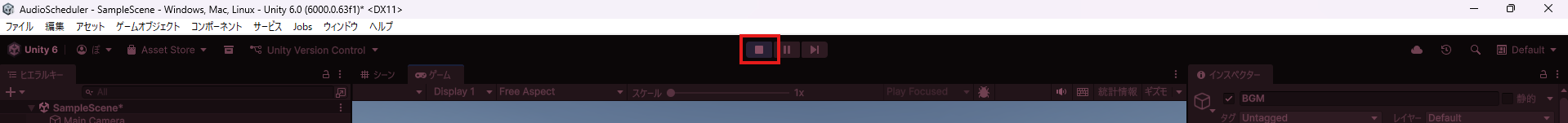 これでOK。ゲーム再生ボタンをクリックするとゲームが実行され、音楽が流れます。この状態でPlayボタンを押すと、さっき書いたスクリプトのPauseIfPlayingElsePlay関数が呼び出されて再生・一時停止ができます。