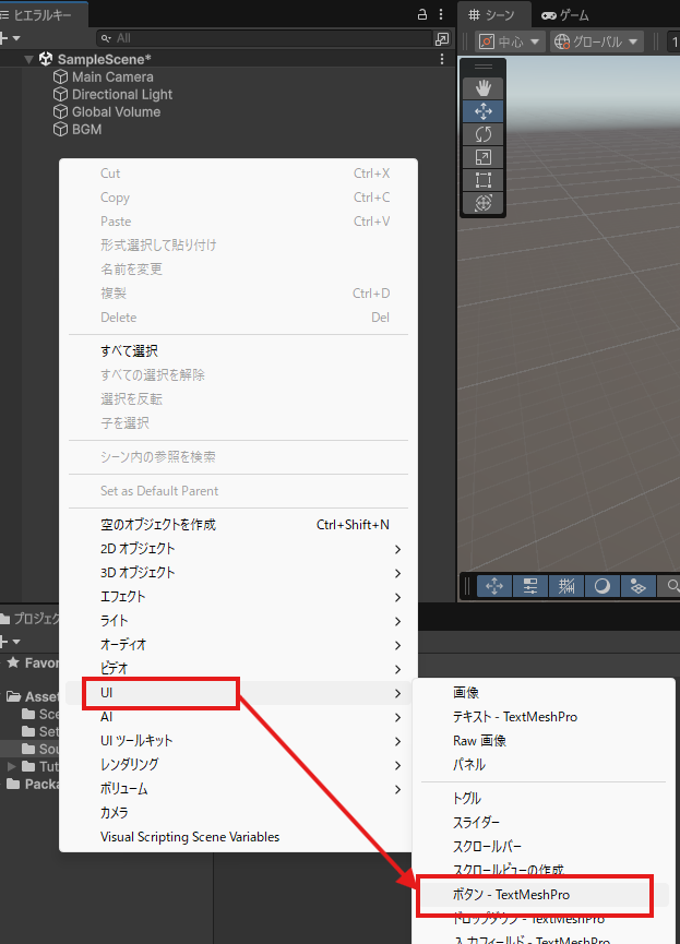 ボタンのオブジェクトを作ります。ヒエラルキーの空きスペースを右クリック→UI→ボタン-TextMeshProを選択。