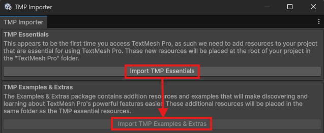 TMP Importerが出たら、「Import TMP Essentials」→「Import TMP Examples & Extras」をクリック。両方終わったらこのウィンドウは消してOKです。TMP Importerが出なければたぶんそれはそれでOK。