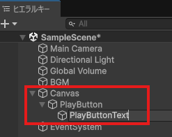 ヒエラルキーを見ると、Canvasの中にButton、その中にText(TMP)ができています。ボタンとテキストの名前をわかりやすいものに変更します。Button→PlayButton、Text(TMP)→PlayButtonTextに変更。