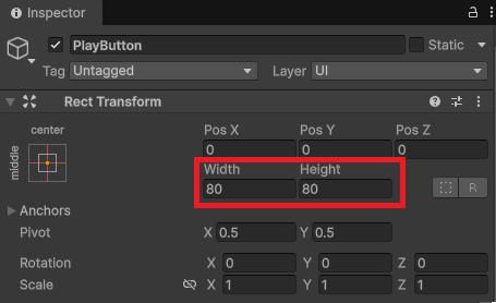 ボタンのサイズを変更します。ヒエラルキーでPlayButtonを選択。インスペクターのTransformでボタンの配置とサイズを調整します。今回は位置XYZを全て0、幅と高さを両方80に設定しました。