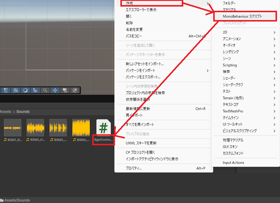 Soundsフォルダ内の空いている場所を右クリック→作成→MonoBehaviourスクリプトを選択。NewMonoBehaviourScriptというファイルが作られるので、名前を確定せず即座にBgmControllerに書き換えて、エンターキーで確定します。一度名前を確定して後から変更するとバグの原因になるので、確定してしまったらもう一度作成し直したほうがいいらしいです。