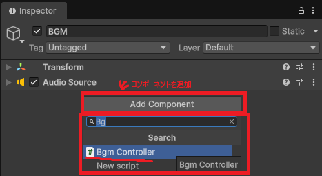 Unityに戻って、BGMインスペクターの一番下にあるコンポーネントを追加から、BgmControllerを検索してクリック。インスペクターにBgmControllerが追加されます。