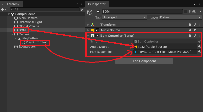 追加されたBgmControllerの中に、「オーディオソース」と「Play Button Text」があるので、オーディオソースにヒエラルキーのBGMをドラッグ&ドロップ。Play Button Textのほうには、ヒエラルキーのPlayButtonTextをドラッグ&ドロップします。