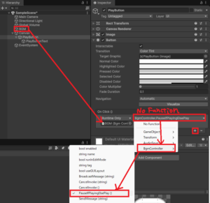 ヒエラルキーでPlayButtonを選択して、インスペクターの下の方にある「クリック時 ()」の+をクリック。なし (オブジェクト)のところに、ヒエラルキーのBGMをドラッグ&ドロップ。No Functionをクリックして、BgmContlloer→PauseIfPlayingElsePlayを選択。