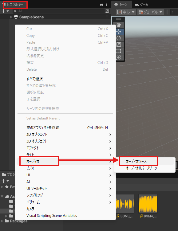 まず音を鳴らすオブジェクトを作ります。ヒエラルキータブの空いているスペースを右クリックして、オーディオ→オーディオソースを選択。