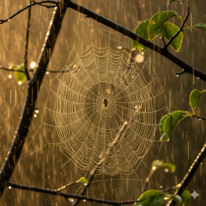 *雨降りに 黄金に輝く 蜘蛛の糸