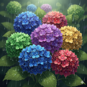 *梅雨にきらめく 紫陽花は色とりどりの宝石かな
