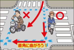「自転車は、信号が付いていなくても、どんなに小さい道でも、全ての交差点と丁字路は二段階右折を行います。」