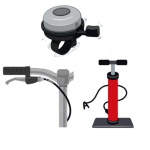 警笛としてのベルや発音機が付いていないと、「事故直前の場面」や「警笛を鳴らす通行帯」で鳴らすことが出来ないので、適切なベルを直ぐ鳴らせる位置に取り付けましょう。 - 自転車の前後、左右、高さを大きくはみ出している取り付け物や荷物など