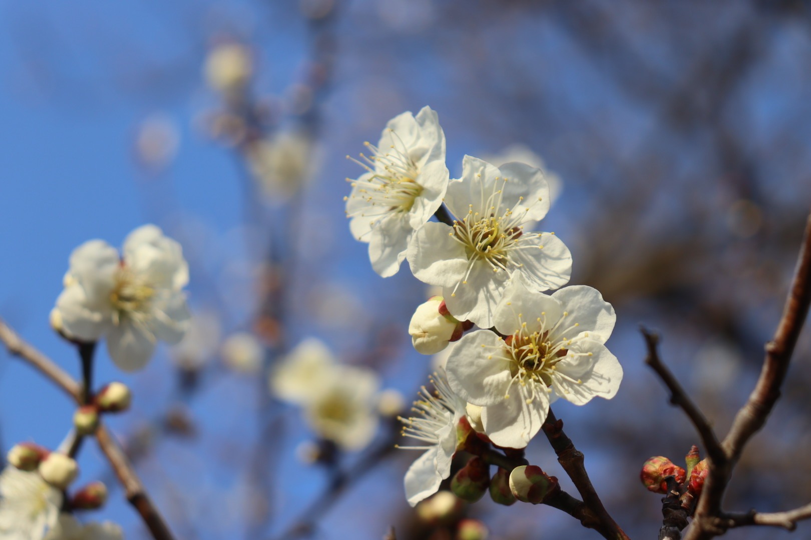 梅の花はたくさんの木が開花して見頃の雰囲気になっており、花を見たり写真を撮って楽しむ人々の姿が多く見られました。