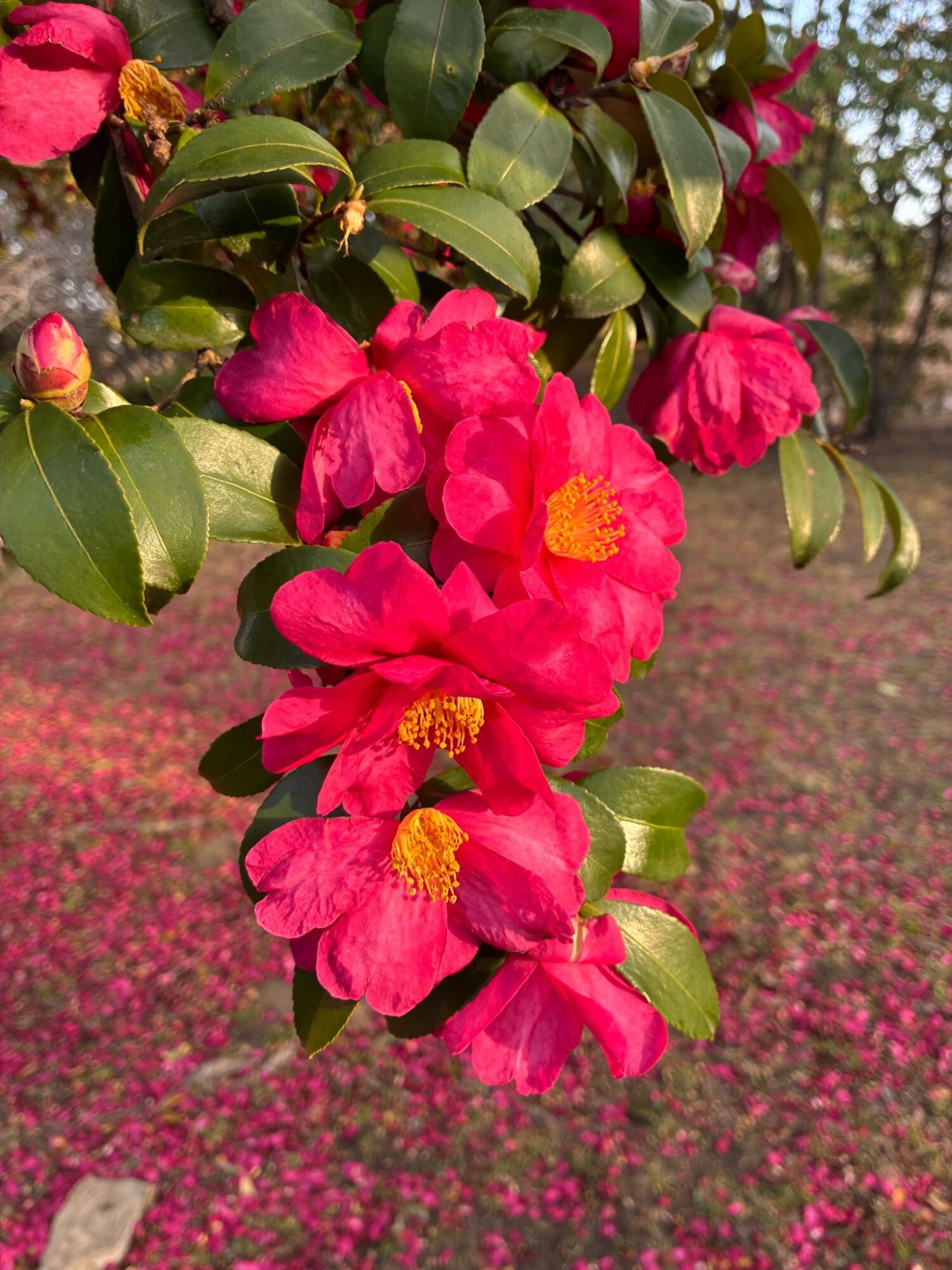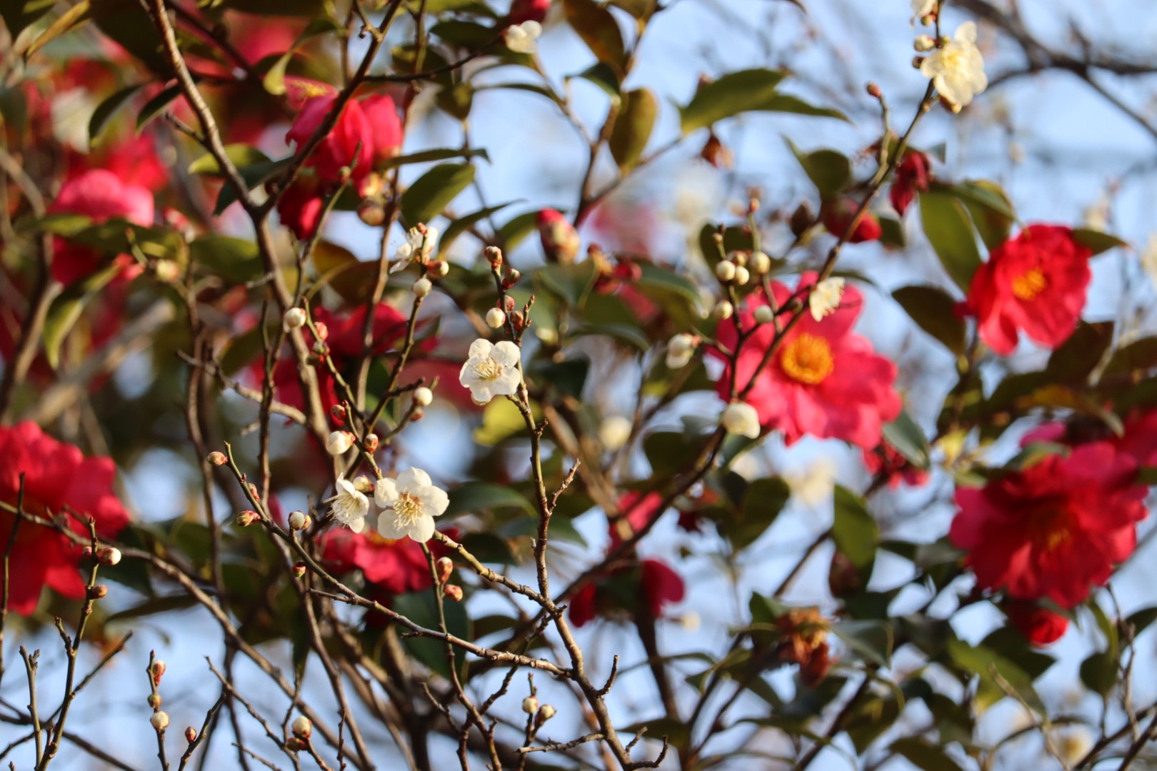 園内を歩いていると、大きなサザンカの木と梅の木が隣接している場所がありました。