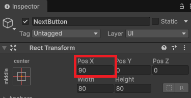 ボタンの位置を変更します。別にどこでもいいんですが、今回はいい感じに真ん中に並ぶようにしてみます。ヒエラルキーでNextButtonを選択した状態で、インスペクターのRect TransformにあるPoz Xに90と入力。PrevButtonも同じように、こちらは-90と入力します。