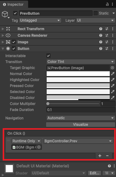 ヒエラルキーでPrevButtonを選択してインスペクターを見ると、下の方にあるクリック時 () のところにPauseIfPlayingElsePlayが入っています。これをBgmController.Prevに変更。