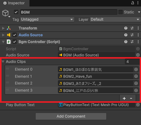ということで、BgmControllerに複数曲設定できるように枠を増築します。