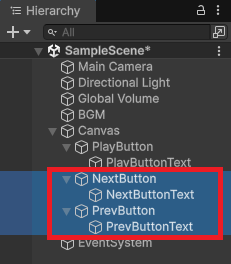 次に送るボタンと前に送る(戻す?)ボタンを追加していきます。ボタンの2つのボタンを追加します。ヒエラルキーのPlayButtonを右クリックして複製。名前を下記に変更。
