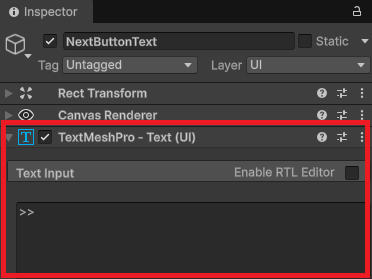 ボタンの表示内容も変更します。ヒエラルキーでNextButtonTextを選択した状態で、インスペクターの中にTextMeshPro-Text(UI)があるので、この中のText Inputに>>と入力。PrevButtonTextも同じように、こちらは<<と入力します。
