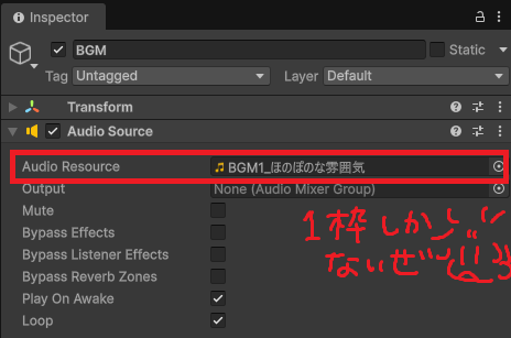 でもBGMオブジェクトには曲が1曲しか入ってないし、そもそも曲を入れる枠が1つしかなくて、複数曲設定できません。