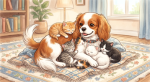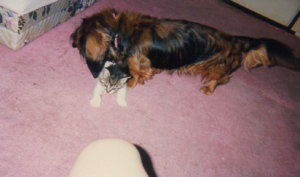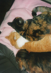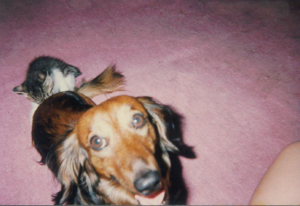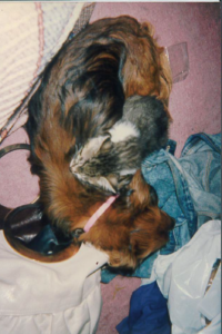 ②その後、私はダックを連れて実家に帰りました。その時、実家には数匹の猫がいました。ダックはその猫達とすぐ仲良くなりました。更に猫好きの母は野良猫にもえさをあげていたので、庭にも数匹の猫がいました。玄関にペットキャリーを置いていましたが、ある時、1匹の野良猫が、そこで5匹の子猫を産みました。親猫はたまに出入りしてそこで育て始めました。うちも猫がいつでも出はいり出来るようには開けっぱなしにしていました。そしてまたある時、ダックの姿が見えないので探すと、子猫のいるキャリーに入って5匹の子猫を愛おしそうに抱えて毛づくろいしていました。きっとアンナを思い出していたかのようでした。親猫は外に遊びに行っていて、いませんでした。