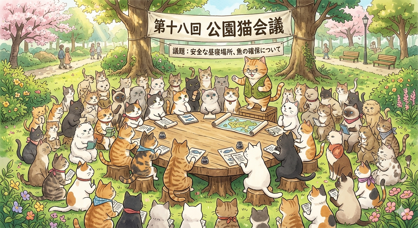 よく夜になると近くの公園に猫たちが集まり猫会議をしていると言われます。本当じゃないのかなと思います。うちの猫たちもよく夜出ていくので何処に行くのだろうと、ついて行った事があります。。近くの公園に入って行きました。すると、たくさんの猫達が集まっていました。ちょっと、恐い光景でしたが。何の会議をしているのかなと思った私でした。