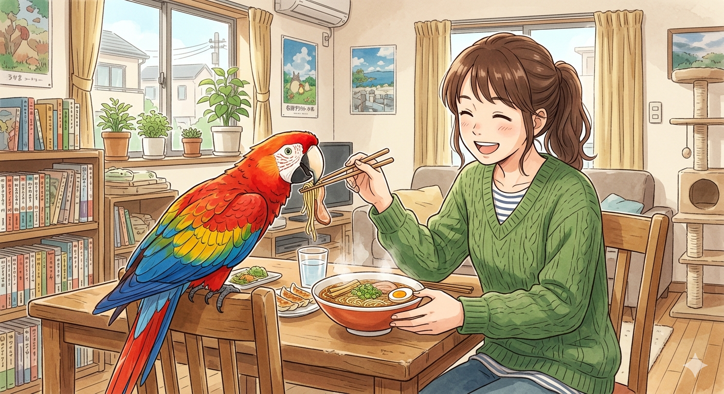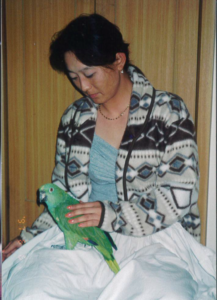 迷った挙句、雄にしたそうです。ところが、よくしゃべるものの、かなり狂暴だったらしく、面倒見切れなくなり、親戚をたらい回しにされた挙句、うちにきました。狂暴だった為、誰も触れず、唯一触れたのが私と母でした。特になついていたのは母にでした。常に一緒にいたのが母だったからです。モコという名前だったのでよく、自分の名前を連呼していました。1,2.1,2と頭を前後に振って体操したり、歌も歌います。得意だったのは「はとぽっぽ」でした。泣きマネと、笑い真似もしました。「おかあさ~ん、おとうさ~ん、おねえちゃ~ん、おにいちゃ~ん」ともよく叫んでいました。主食はひまわりの種でしたが、大好物はラーメンでした。ラーメンを食べていると、頂戴」とおねだりされます。知らん顔していると、「チョーダイヨ」と、さらにおねだり。それでも、知らん顔すると「チョーダイって言ってるでしょ」と、怒ります。これにはみんなで大笑い。それが面白くてつい意地悪してしまいました。(ごめんね)あげると、「おいしい、おいしい」と言いながら食べます。その姿がとても愛らしかったです。