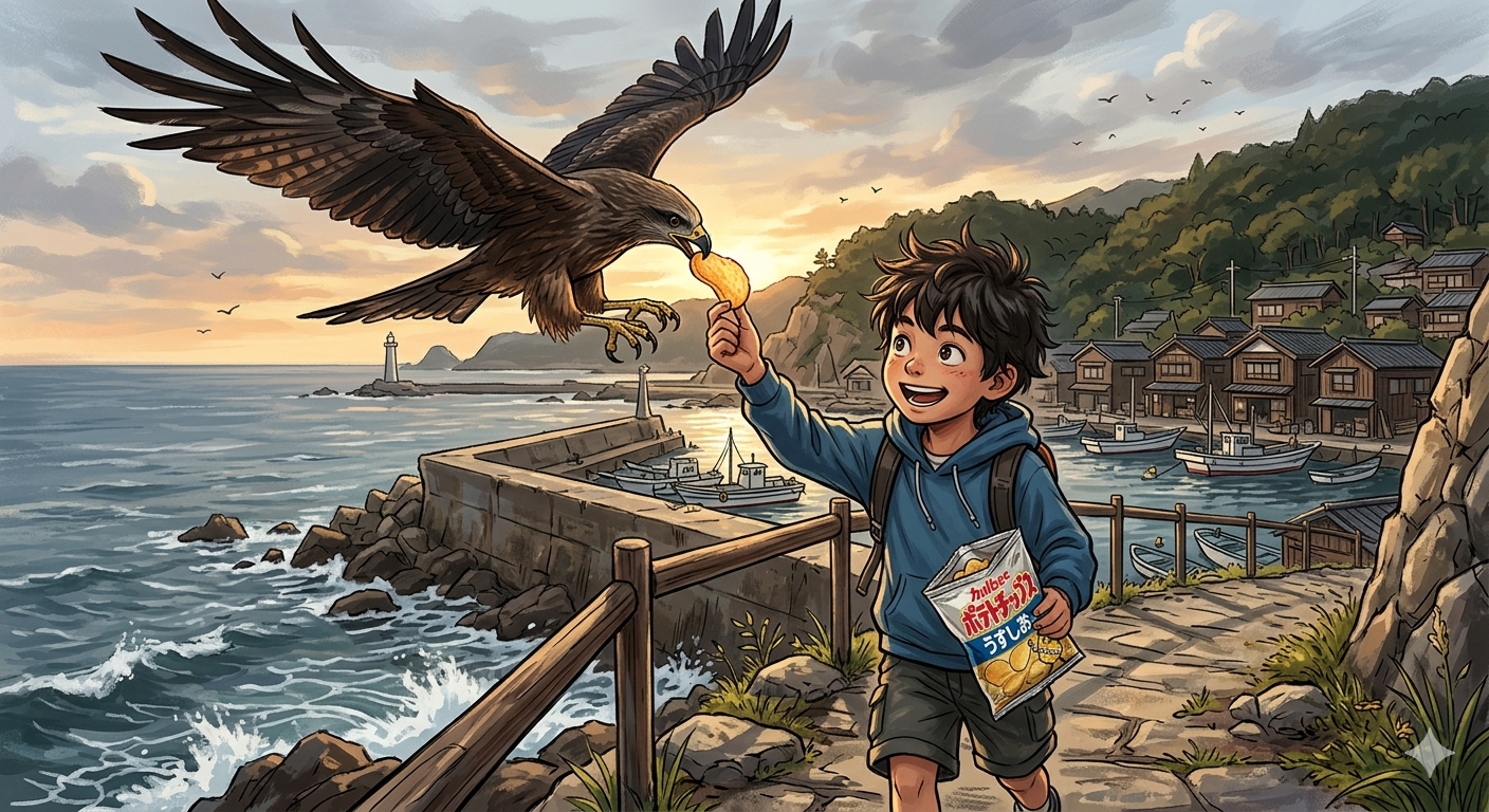 次はちょっとびっくりしたお話、甥を連れて釣りに行った時の事。竿をセットして二人で岸壁を歩いていました。甥はポテトチップスを食べながら歩いていました。そこに空から何かが降りて来て、甥の手からポテトチップを奪って行きました、トンビでした。ちょっと怖かったです。