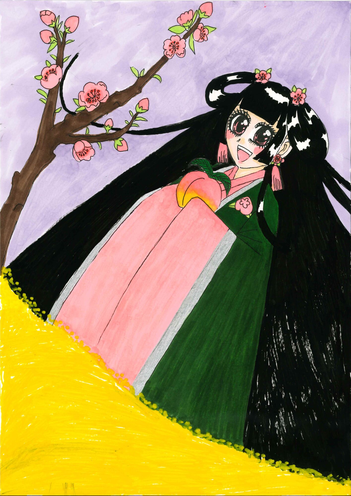 色々な花がありますが。ということで、桃の花と桃と女の子を描きました(*^▽^*)。