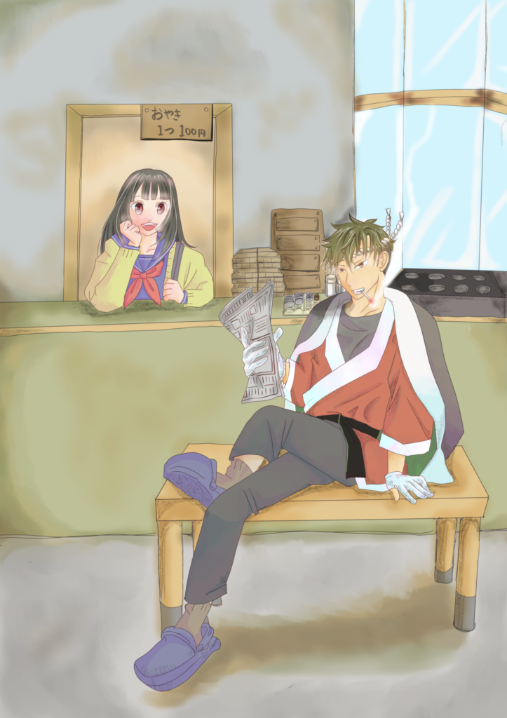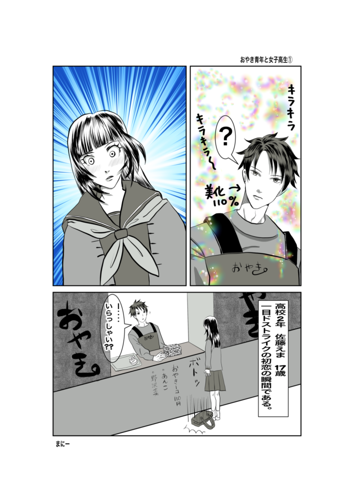 お久しぶりです。以前描いたおやきの青年と女子高生のイラストを漫画にしてみました。