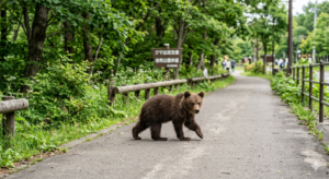 ①ある時の事、私は家族でお墓参りに行こうとして車を走らせていました。すると前から歩道を真っ黒い何かが歩いてきます。犬かと思ったけど、、周りに飼い主らしい人もいなかったので、見ていました。近づいてくると、「あれ!くまじゃない?」どんどん近づいてくると小熊でした。でも小熊がいるということは、近くに親ぐまもいたと思います。思わず、脇に車を止めました。裏は山でした。そこは歩道と山の間に、鉄の柵がありました。そしてその柵には20センチ位のすきまが10センチ間隔で空いてました。突然脇に車が止まったので、熊もびっくりしたのでしょう。その隙間に頭をつっこもうとしましたが、いくら子熊といえども、無茶な話です。しばらく格闘していました。「いやいや、無理だって」と突っ込みたくなるような光景でした。でも、30分後くらい、何とか通り抜けることに成功し、山に帰って行きました。思わず拍手を送った私達です。(後から聞いた話ですが、熊を見かけたら、即座に警察に連絡しなければいけないそうです。)とっさのことで、写真をとることも出来なかったです。「あー、写真」と思い立った時にはすでに逃げた後でした。後悔です。