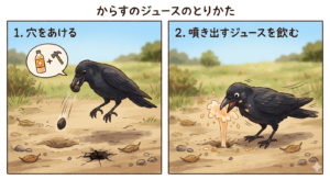 ③次はからすですが、友達とピクニックで山に行った時の事、そこに設置してあった、テーブルにお弁当やジュースを広げました、私達も馬鹿なので置いたまま散策に行きました。そして戻ってみると、カラスが食い散らかしていました。からすは頭のいい鳥なので、パックを開け、きれいに中身だけ食べていました。私達はその場を離れお弁当は諦め、見ていました。しばらくすると、からすが戻って来ました。警戒するように飛んだ後、大丈夫だと思ったらしく、ジュースをめがけて、舞い降りてくると、ジュースをくわえ、又、飛び立って行きました。すると、上から何度もジュースを落としています。しばらく繰り返すと、ペットボトルや缶に穴が開き中身が噴き出してきました。それを器用に口で受け止めて飲み始めました。この話は、テレビで聞いた事があり、「まさかー、うそだー」と思っていたけど。本当だったんだと、思って、びっくりした私達です。