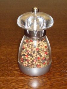 その頃は知らなかったのですが、下側にダイヤルのついたコショウ挽きというものがあり、それだとコショウの粒の粗さを加減できる事をかなり後になって知りました。