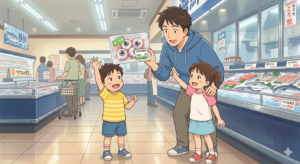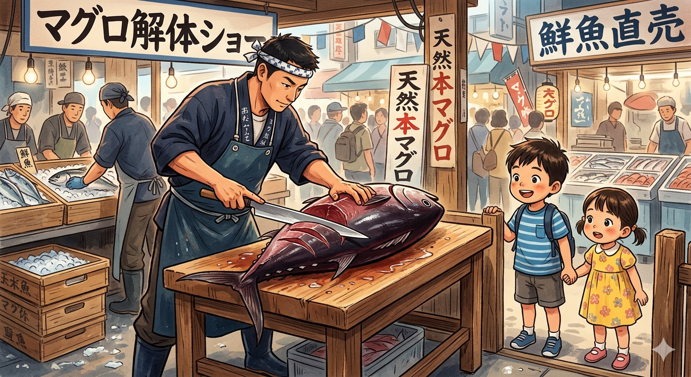 ③私の息子と姪が何故か魚の目玉が大好きでした。(ちなみに私は食べられません)お店で、まぐろの解体ショーをやりました。それを見に来た二人。少し高い位置だったので店長が二人の為に台を用意してくれました。(とても優しい店長でした。)始まり、解体したマグロがどんどん売れていきました。そしたら、鮮魚のチーフが「目玉欲しい人?」と言うと、うちの息子と姪っ子が二人で「はーい」と手を上げました。周りにいた人達がびっくりしていました。もちろん、少し離れた所で見ていた私も驚きました。近くにいたおばさまに、「僕、美味しいの?」と聞かれ、二人で声をそろえて、「美味しいです」と答えていました。そして二人で刺身の他に目玉を二つ買って帰りました。一緒に住んでいたおばあちゃんが、目玉を買ってきた孫たちに驚いたようです。焼いた目玉を美味しそうに食べていた子供達ですが、私達大人は、目が点でした。