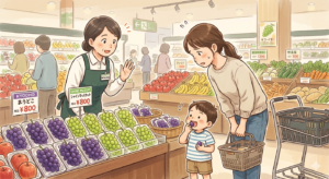 私の後ろをちょこちょこついてきていました。振り返り、「はやくおいで」と声をかけ見ると、息子がもぐもぐと口を動かし、何かを食べています。何もあげていないので、「ちょっと、何を食べてるの?」と聞きました。息子は一言「ぶどう」と言いました。でもあげていないので、「どっから持ってきたの?」と聞くと「こっち」と果物売り場に連れていかれました。そして、売り物の巨峰を指さすと「これ」と言います。見ると1粒無くなっていました。ぶどう好きの息子の仕業です。びっくりしましたが、もちろん、お店の人に謝罪し、お金を払いました。そして息子には、「お店のものを勝手に食べてはいけないんだよ」と教えました。欲しい時には言ってね。ちゃんとお金を払おうねとも。何とも可愛い息子でしたが、母はあせりました。でも、私がお店の人に説明をして謝っている時、その横で息子もちゃんと「ごめんなさい」と言っていました。