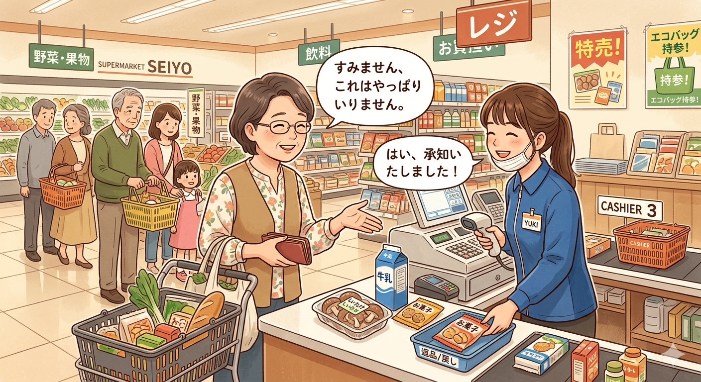 このようにスーパーは色々な事があります。常識を持って、お買い物を楽しみましょう。子供達へのお手本となるように。そして、せっかくの楽しいお買い物を、嫌な気分で終わらないように。又皆様とここでお会い出来る日をお楽しみに。よろしくお願いします。