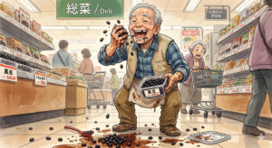 エピソード①ある時、お客様から気持ち悪い人がいるとの指摘を受けました。言われた場所に行くと、一人のお爺さんがいました。おじいさんの前には、試食で黒豆をパックに入れて出していました。ちゃんと爪楊枝をおいていました。見ていると、そのおじいさん、パックに手と顔を突っ込み、手づかみで食べているので、「お客様、これはみんなが食べるものです。爪楊枝がここにありますよ。」と注意しました。すると、手にいっぱい黒豆をつかむと、食べながら逃げて行きました。でも、黒豆は汁がたくさん入っています。そのおじいさんが帰った後がひどかったです。床から、棚から、黒豆の汁だらけでした。掃除が大変でした。