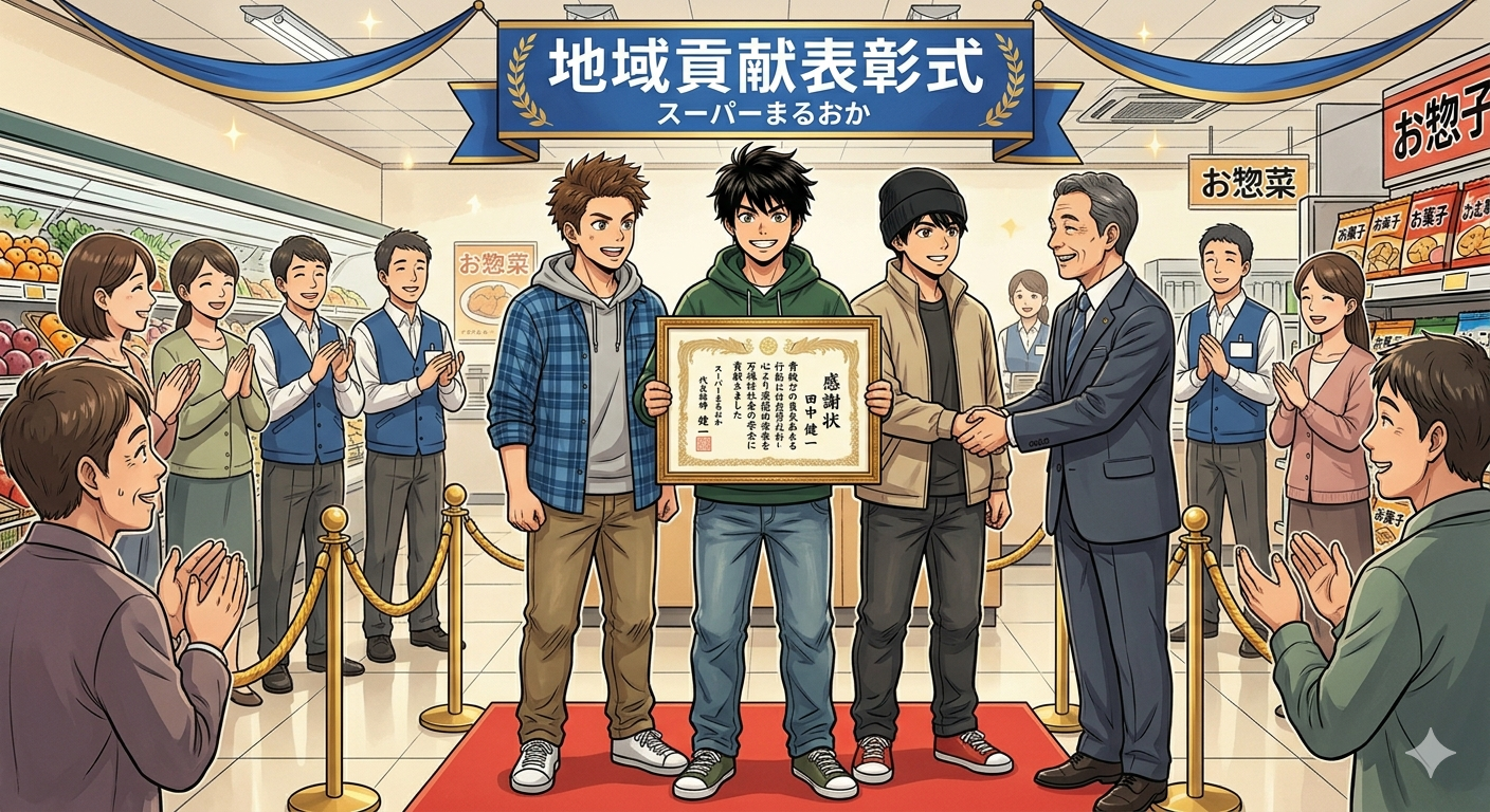 エピソード④うちの店の向かいには専門学校がありました。ある時、万引き犯を追っていましたが、声をかけたところで逃げられました。それを見ていた専門学校の男の子数人が捕まえてくれました。後日、現場検証も行われ、学生さん達に感謝状が手渡されました。