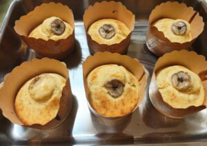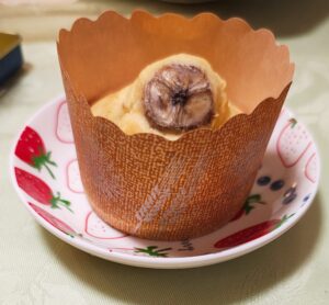 実は、お手本の動画では輪切りのバナナをトッピングとして2枚載せているのですが、今回のマフィンは「家にバナナあるから作ろう!」と軽い気持ちで作りました。バナナの分量が少し足りず、結果トッピングのバナナを減らすことになりました。