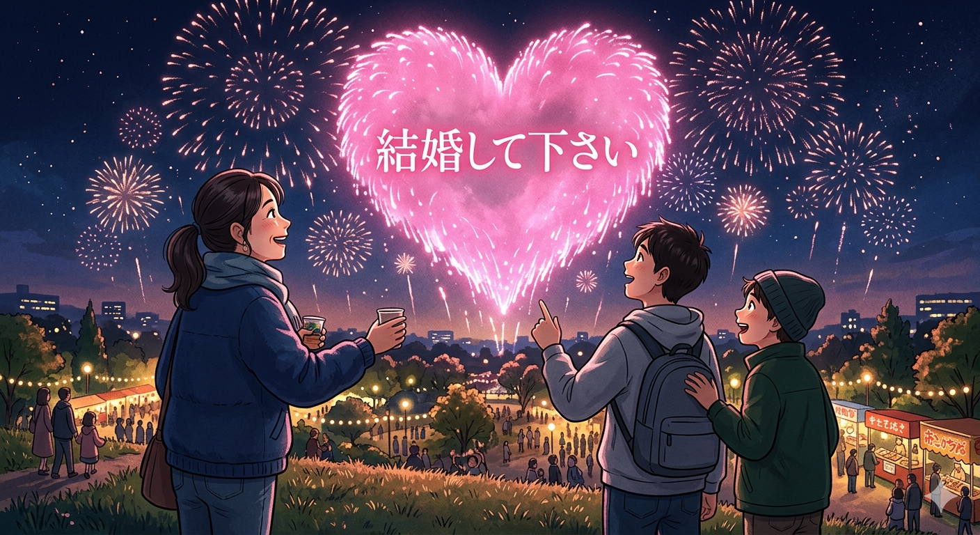 ⑧息子が中学生の時、花火大会を観たいと言われ一緒に見に行きました。見ていると大きなハート型の花火が打ちあがり、真ん中に、○○さん結婚して下さいの文字が。息子に素敵だねと言ったら、一言「無理」でした。事前に申請すると、公開プロポーズをしてくれるそうです。興味のある方は是非どうぞ。